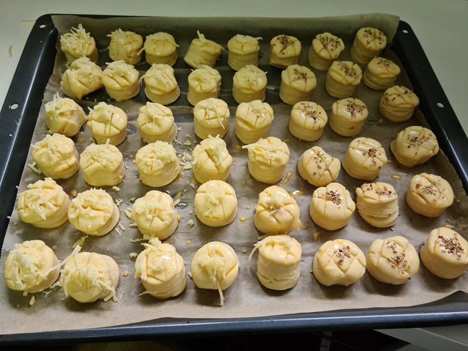 Összegyúrtam, hajtogattam, pihent a hűtőben kb. 3 órát, de ha több, az sem baj, bírja, kivettem, még 1x hajtogattam, kb.1 cm vastagságúra nyújtottam és utána szaggattam. A tepsiben még pihen kb. fél órát a sütés előtt. Tojással kenem, sajttal/szezámmal szórom. Előmelegített sütőben sült 210 fokon kb. 20-25 percet /sütőfüggő.