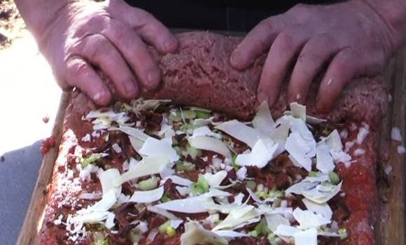 Lapogasd ki a húst, sóval, borssal befűszerezd, kend rá a kedvenc mártásodat vagy szószodat, majd mehet rá a felaprított hagyma, és zellerszár, a durvára vágott sült bacon, és a sajt. Tekerd fel, jó idő esetén tedd a grillrácsra, vagy egy sütő tepsibe, kend be a tetejét a szósszal, és fektess rá néhány szelet nyers bacon szalonnát.
